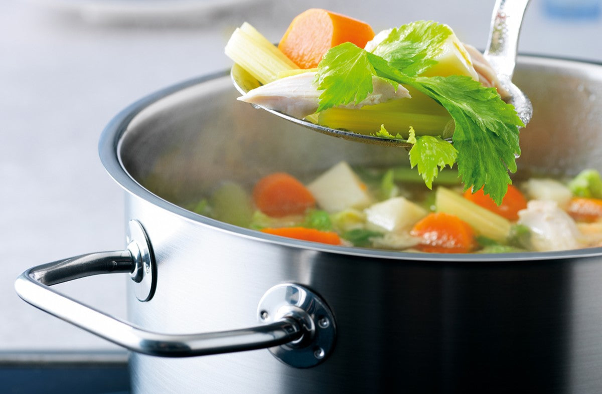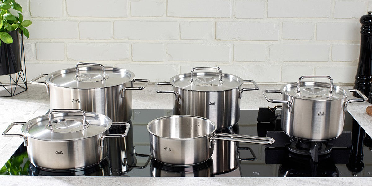 German craftsmanship since 1845 meets cutting-edge technology with the NEW award-winning Fissler M5 Pro-Ply stainless steel cookware. Engineered for exceptional performance, our cookware features a sophisticated 5-layer construction of premium recycled stainless steel and aluminum that heats quickly and offers precise heat control.