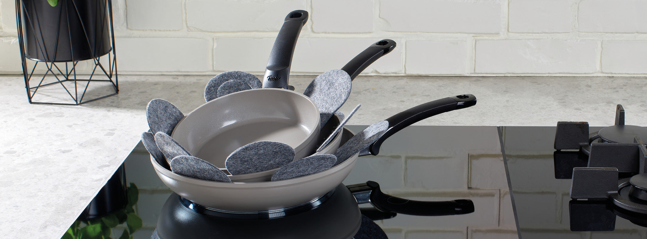 Felt pan protectors to prevent scratches Space in the kitchen is often limited, especially when it comes to storing large pots or pans. If you own several different pans or a pan set with different diameters, you can stack them neatly in your cabinets to save space. To prevent non-stick coatings from being scratched, pan protectors help shield your cookware. Using a pan protector can also save money by extending the life of your pans. The coating lasts longer, reducing the need to replace pans frequently.