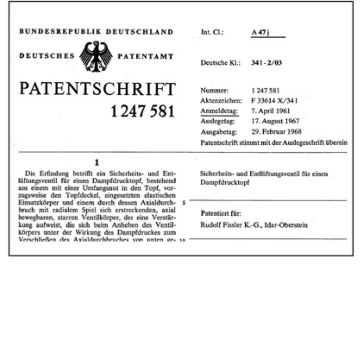 Fissler patents the Unimatik, a “safety- and venting valve for pressure cookers.” As well as automatically venting the excess pressure, the valve prevents unwanted leakage of the pot contents via the valve for the first time inside of the pot from leakage.
