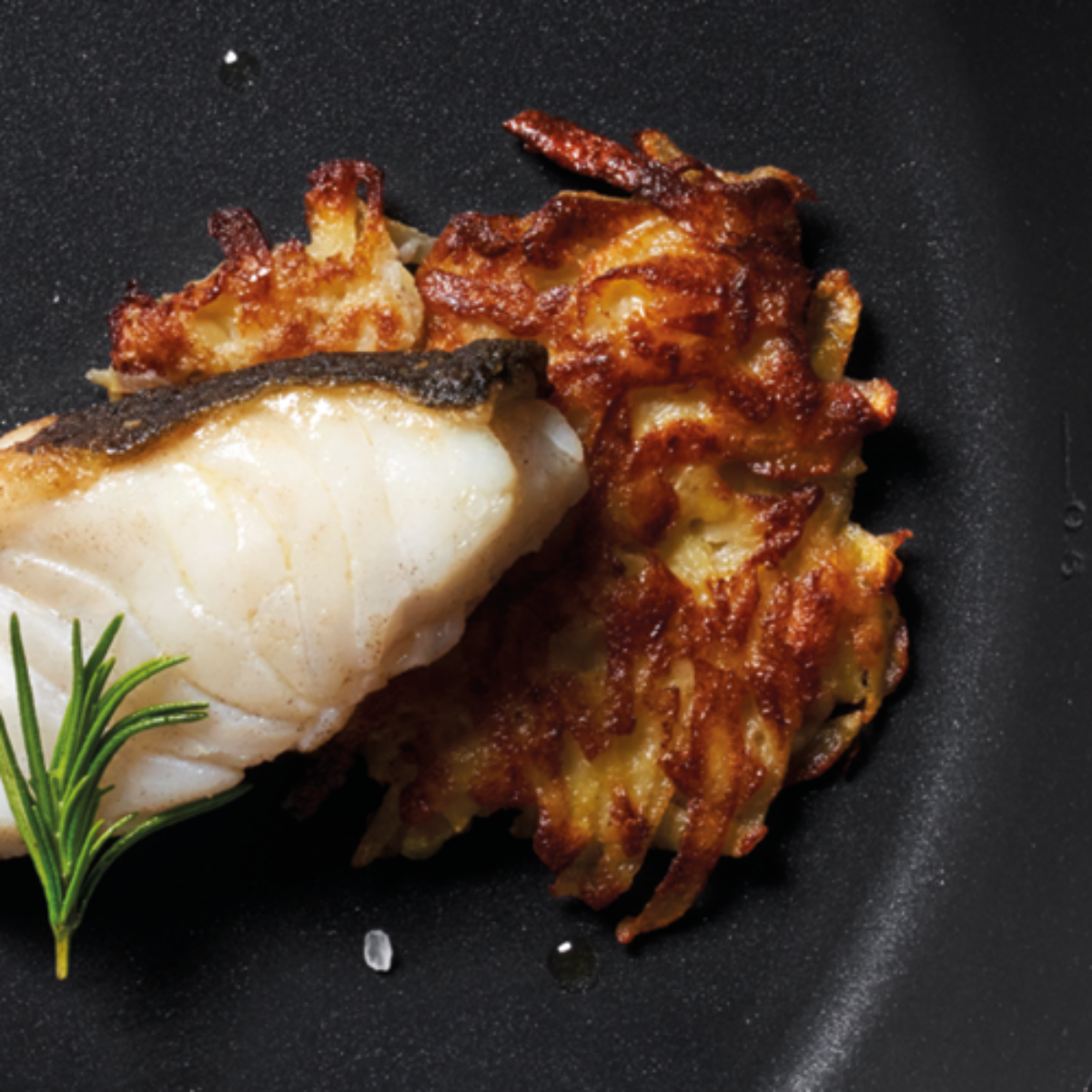 Searing with a grill effect: Fissler invents a waffle structure for its pans that allows frying and searing even with little fat. Today, this innovation is registered as Fissler Novogrill®.