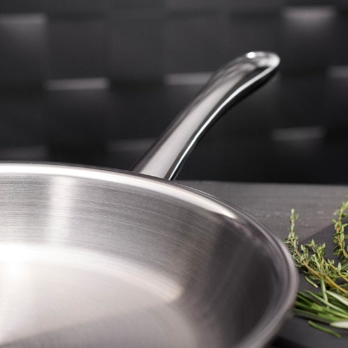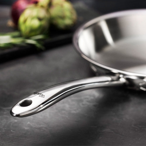 Since 1845, Fissler has blended German craftsmanship with cutting-edge technology and has now created the M5 Pro-Ply, a 5-ply stainless Steel cookware set. This 5-piece set is designed with a 5-layer construction of premium recycled stainless steel and aluminum, ensuring rapid heating and cooling for precise temperature control. The cookware set has a beautiful rivet-free design that is hygienic and easier to clean, while superior German welding guarantees lasting durability, preventing the handle from loosening over time. For added convenience, the sealed rim offers protection against dishwasher corrosion, making it one of the best dishwasher-safe cookware sets available, while the large pouring rim prevents spills. With an ergonomic handle that stays up to 15 degrees cooler than competitors, this versatile set works on all stovetops, including induction, and is oven-safe up to 450°F (230°C). Made without PFAS, these stainless steel pots and pans provide superior performance for all your cooking needs. 5-Piece Cookware Set Includes: 3-Quart, 8" Saucepan with Metal Lid; 3-Quart, 9.5" Sauté Pan with Metal Lid; 10" Frying Pan.